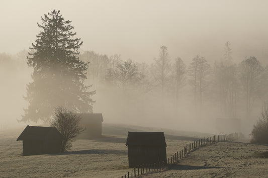 Holzdruck „Frühnebel im Murnauer Moos“ (30x20 cm)